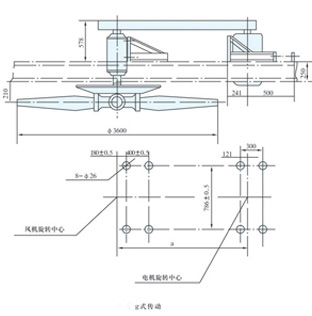 適用于3.6米手調(diào)風(fēng)機(jī)及4葉自調(diào)或半自調(diào)風(fēng)機(jī),吊掛式、引風(fēng)式,安裝尺寸見表